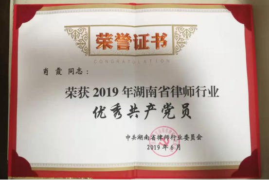 为表彰先进、弘扬正气,激励律师行业党组织、广大党员律师和党务工作者履职尽责、再创佳绩,6月18日,湖南省律师行业党委对6个基层党组织、15名党员律师和6名优秀党务工作者进行表彰,华硕律所党支部肖霞律师经层层推荐、逐级审核,被评为“湖南省律师行业优秀共产党员”荣誉称号。